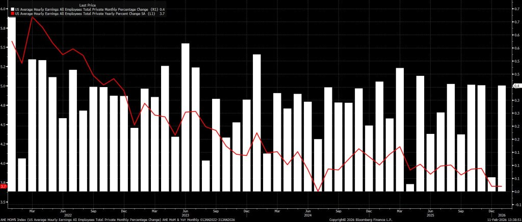 Theo khảo sát việc làm phi nông nghiệp, dữ liệu cho thấy áp lực lên thu nhập vẫn được kiểm soát khi bước sang năm mới. Tháng trước, thu nhập bình quân theo giờ tăng 0,4% so với tháng trước và 3,7% so với cùng kỳ năm trước—mức tăng tháng cao hơn một chút so với dự báo, nhưng vẫn chưa đáng lo ngại.