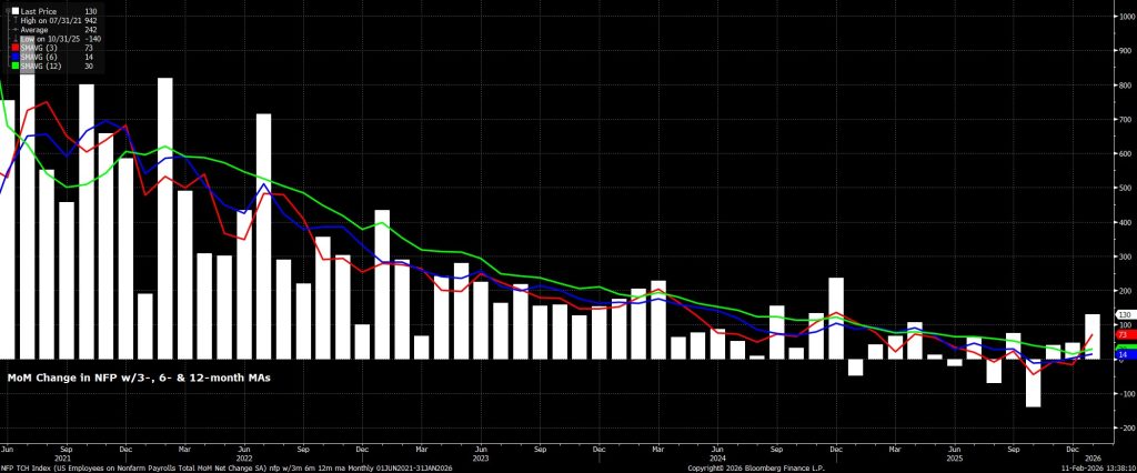 Số lượng việc làm phi nông nghiệp (nonfarm payrolls) tăng thêm 130.000 trong tháng 1, cao hơn đáng kể so với mức dự báo trung bình là +65.000, dù vẫn nằm trong biên độ dự báo vốn luôn rất rộng, từ -10.000 đến +130.000. Tuy nhiên, cần lưu ý rằng vẫn tồn tại những lo ngại về chất lượng dữ liệu—đặc biệt là khi Chủ tịch Fed Powell gần đây từng nhấn mạnh con số việc làm công bố có thể đang thổi phồng mức tăng trưởng thực tế tới khoảng 60.000 việc làm mỗi tháng.
