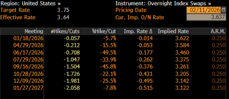 Sau khi báo cáo việc làm được tiêu hóa, thị trường tiền tệ đã điều chỉnh kỳ vọng theo hướng diều hâu hơn: lần cắt lãi suất 25 điểm cơ bản tiếp theo hiện không còn được định giá đầy đủ cho đến cuộc họp tháng Bảy, trong khi trước báo cáo NFP (Non-Farm Payrolls), thị trường đã kỳ vọng động thái này xảy ra vào tháng Sáu. Tuy nhiên, thị trường vẫn dự báo khoảng 50 điểm cơ bản giảm lãi suất sẽ được thực hiện trước cuối năm—chủ yếu do kỳ vọng rằng Chủ tịch được đề cử Warsh sẽ áp dụng lập trường ôn hòa hơn.