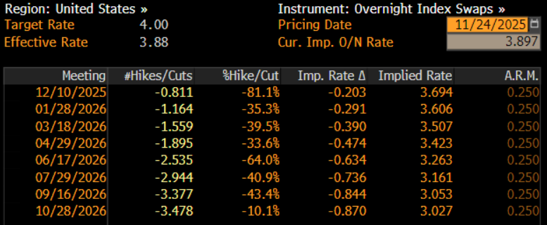 Có lẽ quan trọng nhất trong số đó là triển vọng chính sách tiền tệ tại Mỹ, đặc biệt là khi hầu như không có sự đồng thuận về hướng đi của cuộc họp FOMC tháng 12. Dù đường cong USD OIS hiện định giá khoảng 80% khả năng Fed cắt giảm 25 điểm cơ bản tại cuộc họp cuối năm, nhưng động thái này còn lâu mới là “chắc chắn”. Những bình luận gần đây từ các quan chức Fed cho thấy Ủy ban đang chia rẽ gần như 50/50 giữa việc cắt giảm thêm hoặc giữ nguyên. Ngoài ra, cũng tồn tại nhiều dấu hỏi về lộ trình chính sách trong năm 2026, khi sự chia rẽ nội bộ — dựa trên triển vọng hiện tại — có thể khiến mỗi lần cắt giảm tiếp theo trở thành một cuộc bỏ phiếu sít sao hơn lần trước.