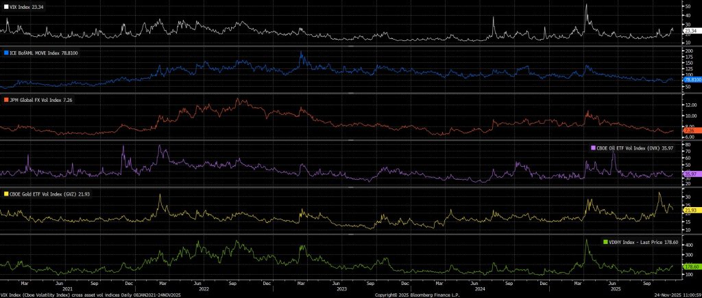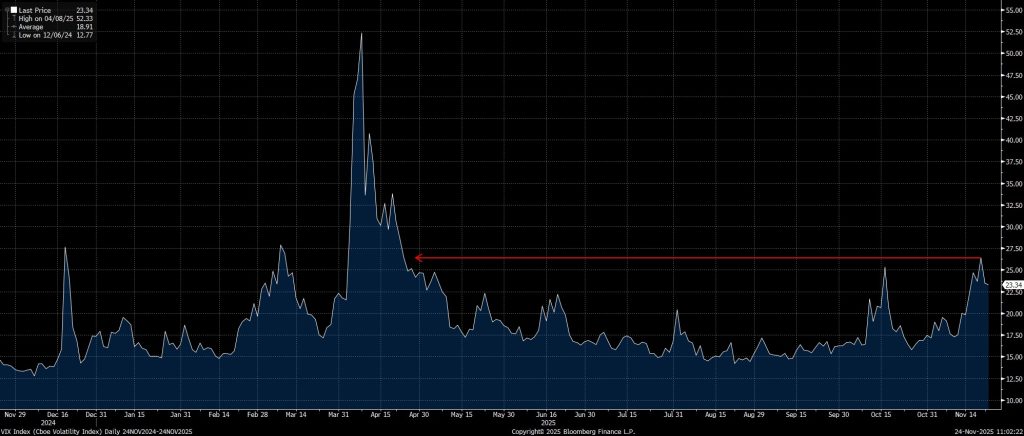 Ở thời điểm hiện tại, biến động cổ phiếu đã tăng đáng kể trong khoảng một tuần trở lại đây, với VIX ghi nhận mức đóng cửa cao nhất kể từ sự kiện “Liberation Day” hồi tháng 4, trong bối cảnh đợt bán tháo mạnh trên Phố Wall. Dù đợt bán tháo này không có chất xúc tác rõ ràng, đà tăng của VIX đến từ biến động thực tế gia tăng, cùng với làn sóng phòng hộ trong thị trường quyền chọn, chủ yếu khi nhà đầu tư tìm cách bảo vệ mức lợi nhuận tích lũy YTD khá lớn của họ.