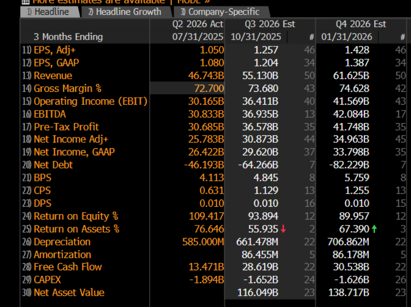 Với kỳ vọng của thị trường được đặt ở mức rất cao, Nvidia có thể sẽ cần công bố doanh thu Q3 khoảng 56 tỷ USD và đưa ra dự báo Q4 ở mức 61,5–62 tỷ USD, với biên lợi nhuận gộp khoảng 74% (Q3) và 74,7% (Q4) để đáp ứng kỳ vọng mạnh mẽ từ phía các quỹ đầu tư. CEO Jensen Huang được kỳ vọng sẽ tiếp tục đưa ra triển vọng lạc quan, như những gì thị trường đã quen thuộc. Nhà đầu tư cũng sẽ theo dõi cập nhật về kế hoạch bổ sung 14 triệu GPU (như công bố tại GTC cho năm tài chính 2025/26) và tiến độ khoản đầu tư 100 tỷ USD vào OpenAI.