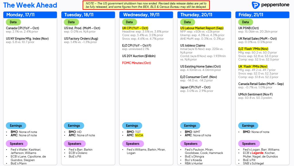 Rủi ro sự kiện quan trọng trong tuần này dường như được chia đều giữa mùa báo cáo lợi nhuận doanh nghiệp Mỹ và báo cáo việc làm phi nông nghiệp (NFP) tháng 9 của Mỹ. Nhìn chung, kết quả kinh doanh từ các nhà bán lẻ lớn của Mỹ và Nvidia có khả năng sẽ định hướng diễn biến của S&P 500 và Nasdaq 100.
