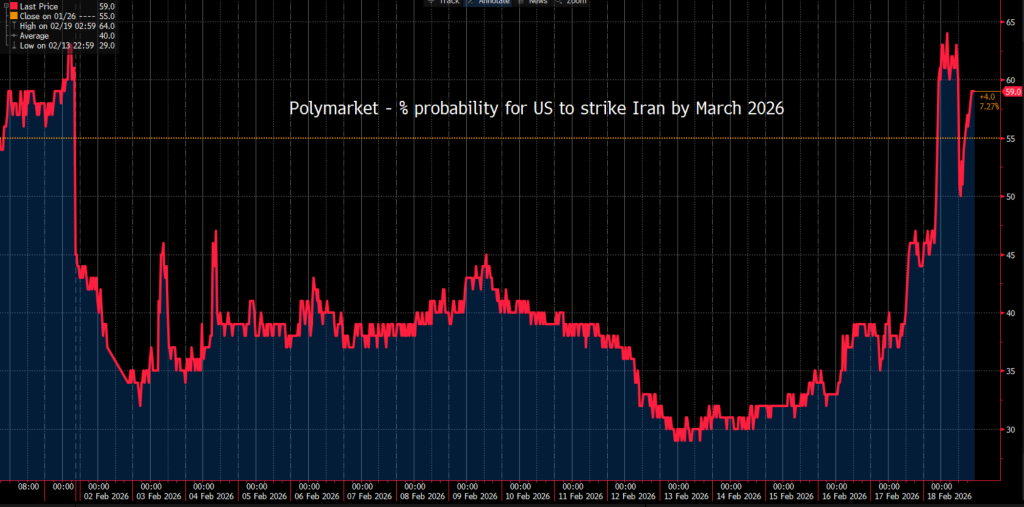 • Xác suất Mỹ tấn công Iran trước cuối tháng Ba đã tăng từ mức khoảng 30% lên 57%, từng chạm mức cao nhất ngắn hạn là 65%.