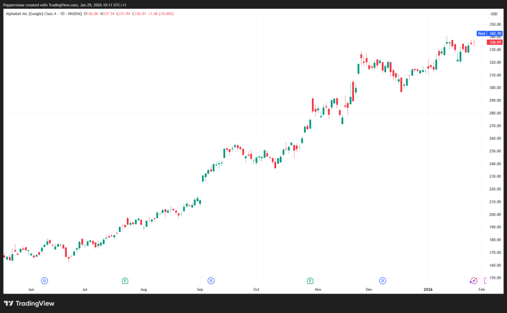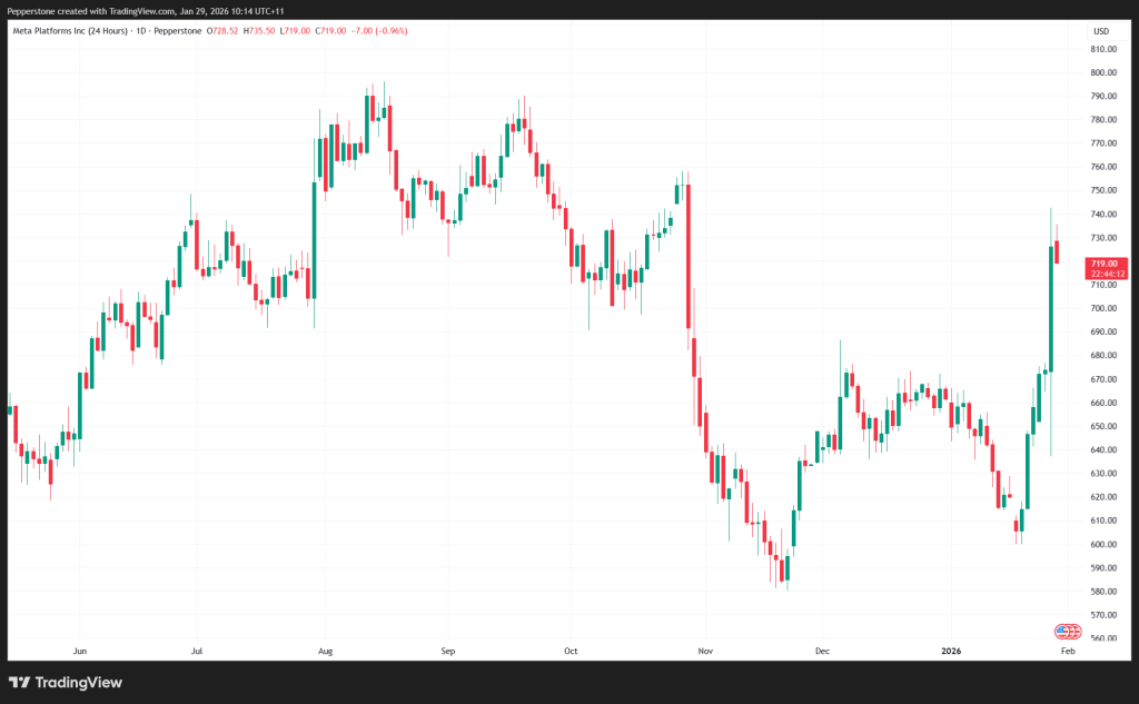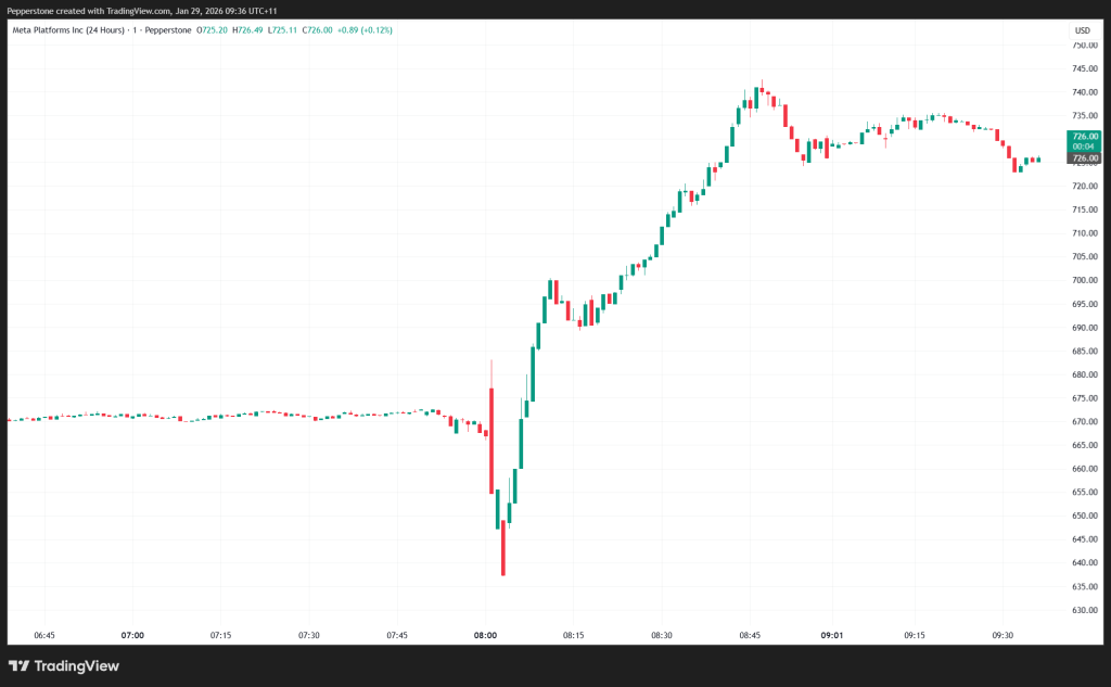 Cổ phiếu Meta tăng khoảng 9% trong giao dịch sau giờ. Ban đầu, cổ phiếu đã giảm mạnh ngay sau khi công bố kết quả kinh doanh, do nhà đầu tư phản ứng trước hướng dẫn chi phí năm tài chính 2026 cao hơn và mức tăng đáng kể trong kế hoạch chi tiêu vốn (capex) dự kiến cho năm tài chính 2026. Tính từ mức đáy sau thông báo là 637,13 USD (theo CFD 24 giờ của Pepperstone), giá cổ phiếu đã đảo chiều mạnh mẽ, tăng 14,5%. Đối với một công ty có vốn hóa thị trường vào khoảng 1,68 nghìn tỷ USD, mức biến động mạnh mẽ như vậy thật sự rất ấn tượng.