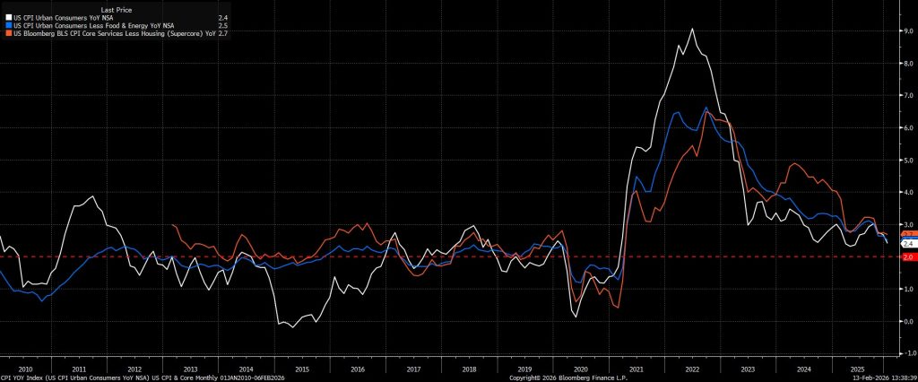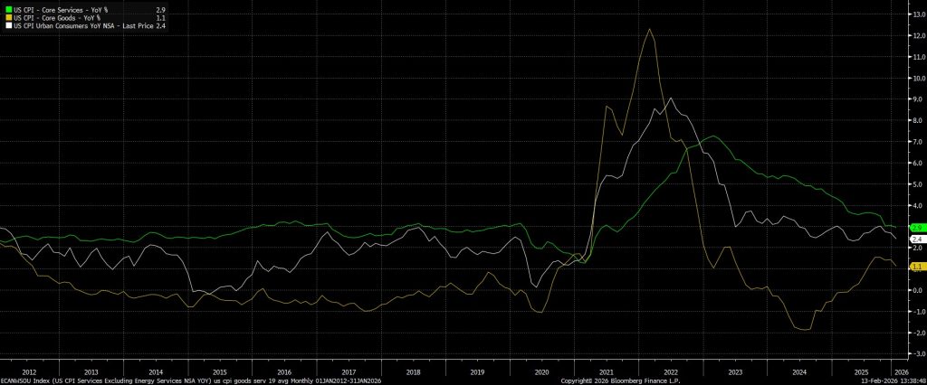 Cụ thể, giá hàng hóa lõi (core goods) trong tháng Một tăng 1,1% so với cùng kỳ năm trước — tốc độ chậm nhất trong sáu tháng qua, ngụ ý rằng đỉnh điểm của việc chuyển gánh thuế quan vào giá cả có lẽ đã qua, trừ phi có thêm các loại thuế mới được áp dụng. Đồng thời, lạm phát dịch vụ lõi (core services) lần đầu tiên giảm xuống dưới mức 3% YoY kể từ giữa năm 2021, khả năng làm dịu bớt lo ngại về rủi ro áp lực giá kéo dài dai dẳng.