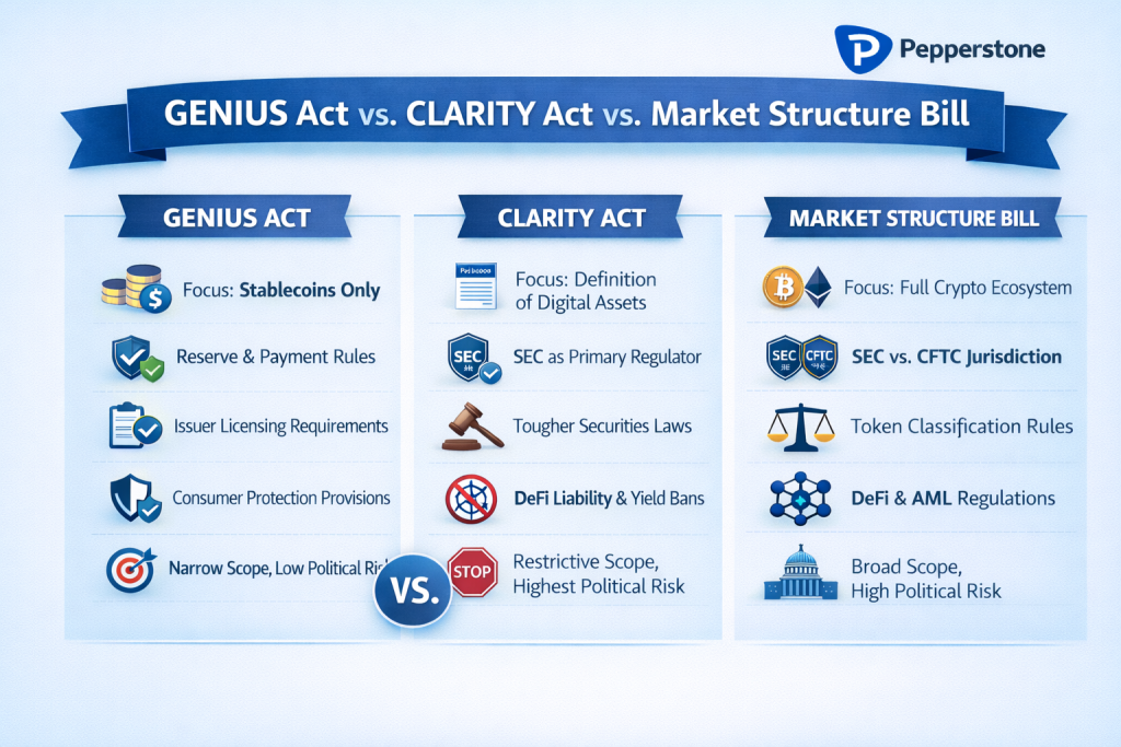 Cốt lõi của Dự luật Cơ cấu Thị trường là thiết lập khuôn khổ pháp lý toàn diện đầu tiên tại Hoa Kỳ dành cho tiền mã hóa. Dự luật này định nghĩa rõ ràng thế nào là token kỹ thuật số, làm rõ cơ quan quản lý chịu trách nhiệm, quy định cách thức phát hành và giao dịch tài sản crypto, đồng thời đưa ra các tiêu chí cụ thể về cách thức xử lý các hệ thống phi tập trung. Mục tiêu của đạo luật là cân bằng giữa đổi mới sáng tạo, bảo vệ người tiêu dùng và an ninh quốc gia. Trong khi dự luật GENIUS tập trung chủ yếu vào stablecoin, thì dự luật này nhằm định nghĩa toàn bộ hệ sinh thái tiền mã hóa.