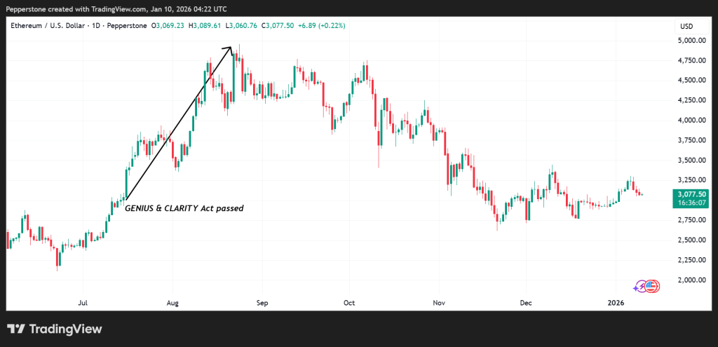 Dự luật Cơ cấu Thị trường lần này là phiên bản toàn diện và phát triển hơn so với hai đạo luật GENIUS và CLARITY đã được thông qua vào tháng 7 năm 2025. Cụ thể, sau khi GENIUS và CLARITY được thông qua, giá Ethereum đã tăng mạnh 60%, kéo theo đà tăng mạnh mẽ trên toàn bộ thị trường crypto trong 39 ngày tiếp theo.