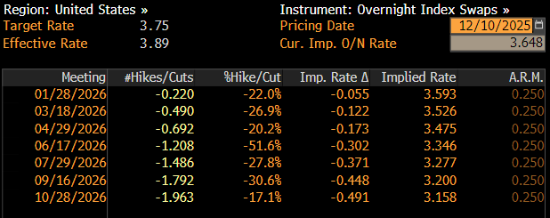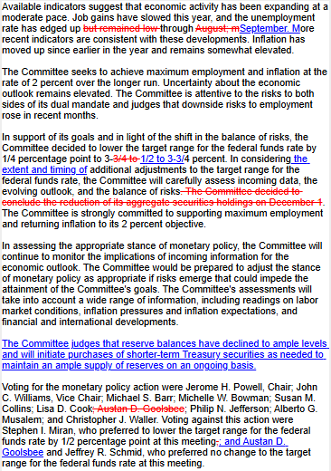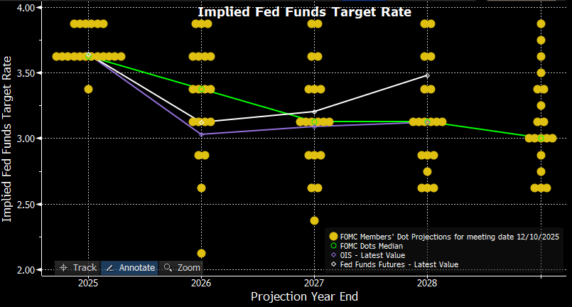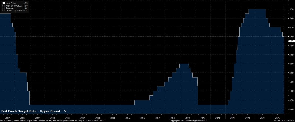 Đúng như dự đoán, FOMC đã thực hiện lần cắt giảm 25 điểm cơ bản thứ ba liên tiếp tại cuộc họp chính sách cuối cùng của năm nay, đưa biên độ mục tiêu của lãi suất quỹ liên bang xuống 3,50% – 3,75%, hoàn toàn phù hợp với mức mà thị trường tiền tệ đã định giá đầy đủ trước khi công bố.