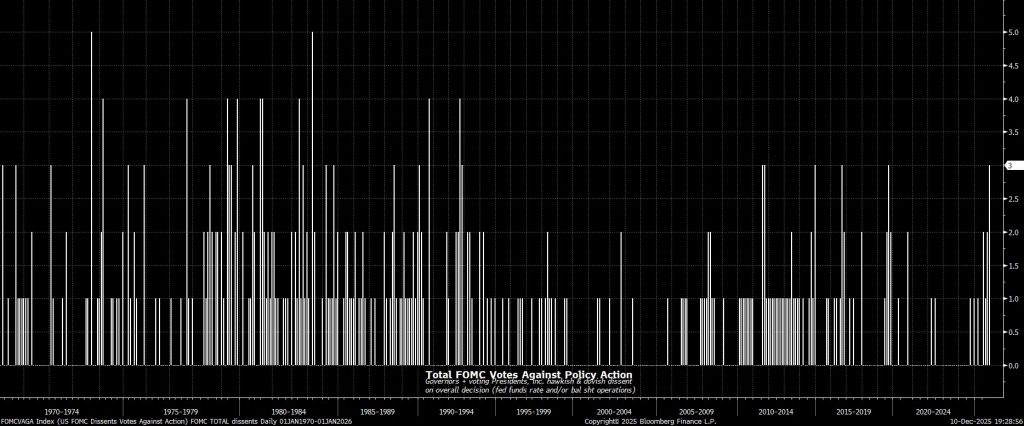 Thực tế, sự chia rẽ giữa các thành viên của Ủy ban đã sâu sắc hơn so với cuộc họp trước. Tại cuộc họp tháng 12, Chủ tịch Fed Chicago Austan Goolsbee đã tham gia Chủ tịch Fed Kansas City Jeff Schmid trong việc phản đối và muốn giữ nguyên lãi suất. Trong khi đó, Thống đốc Miran, có khả năng đây là cuộc họp áp chót của ông, lại tiếp tục bất đồng khi ủng hộ mức cắt giảm mạnh hơn 50 điểm cơ bản — khiến cuộc họp FOMC lần này trở thành lần đầu tiên kể từ năm 2019 có ba phiếu bất đồng. Tuy nhiên, vì hai Chủ tịch Fed khu vực sẽ rời khỏi Ủy ban vào cuối năm theo cơ chế luân phiên, sự chia tách trong kết quả bỏ phiếu có hàm ý tín hiệu hạn chế đối với triển vọng chính sách trong thời gian tới.