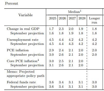 Có lẽ không quá ngạc nhiên khi, do thiếu các dữ liệu kinh tế mới kể từ vòng dự báo trước vào tháng 9, các dự báo nhìn chung vẫn gần như không thay đổi trong toàn bộ giai đoạn dự báo. Trong khi triển vọng tăng trưởng ngắn hạn được điều chỉnh tăng nhẹ — có thể phản ánh tác động thúc đẩy tài khóa từ OBBBA — các dự báo khác hầu như giữ nguyên, với cả PCE tổng thể và PCE lõi vẫn được kỳ vọng sẽ giảm trở lại mức mục tiêu 2% trong ba năm tới.