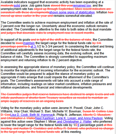 Theo đó, các nhà hoạch định chính sách một lần nữa đề cập đến việc “điều chỉnh thêm” lãi suất quỹ liên bang, ngụ ý rằng khả năng cắt giảm lãi suất tiếp theo vẫn còn để ngỏ, đồng thời lặp lại rằng lạm phát vẫn “vẫn ở mức khá cao”. Tuy nhiên, đánh giá về tình hình kinh tế đã được nâng cấp, khi nhấn mạnh đà tăng trưởng “vững chắc”, và tuyên bố cũng lưu ý rằng tỷ lệ thất nghiệp “đã cho thấy một số dấu hiệu ổn định trở lại”, hàm ý rằng các rủi ro tiêu cực đối với thị trường lao động đã giảm bớt.