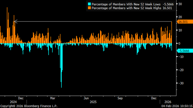 Tuy nhiên, dù nghe có vẻ như đây là một phiên giao dịch khá khắc nghiệt mang tính “né rủi ro” (risk-off), thực tế lại hoàn toàn khác. Trên thực tế, hơn một nửa số cổ phiếu thành phần trong S&P 500 vẫn đóng cửa tăng điểm, bất chấp việc chỉ số này giảm 0,8%—đây mới chỉ là lần thứ 10 trong thập kỷ qua xuất hiện tình huống như vậy. Tương tự, 16,5% số cổ phiếu trong S&P 500 lập đỉnh 52 tuần, tỷ lệ cao nhất kể từ tháng 11 năm 2024.