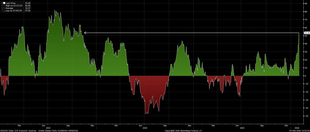 Đồng thời, luận điểm ủng hộ cổ phiếu chu kỳ đang trở nên thuyết phục hơn. Tuần này, chỉ số khảo sát sản xuất ISM đã vươn trở lại vùng mở rộng (trên 50 điểm), đạt mức cao nhất trong 4 năm qua ở mức 52,6, ngụ ý rằng nền kinh tế Mỹ có thể sắp bước vào giai đoạn tăng tốc trở lại. Bên cạnh đó, chỉ số Bất ngờ Kinh tế (Economic Surprise Index) của Citi cho thấy dữ liệu kinh tế Mỹ gần đây đang vượt kỳ vọng với biên độ lớn nhất trong hai năm rưỡi qua, qua đó có thể tiếp tục thổi bùng thêm xu hướng luân chuyển sang nhóm cổ phiếu chu kỳ.