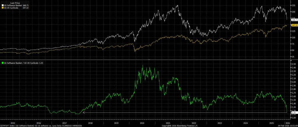 Phiên giao dịch hôm thứ Ba là một minh chứng điển hình. Chỉ số S&P 500 giảm khoảng 0,8%, trong khi Nasdaq 100 sụt hơn 1,5%—rõ ràng là một đợt bán tháo do nhóm công nghệ dẫn dắt, giữa lo ngại rằng các tác nhân AI, đặc biệt là các plugin dành cho doanh nghiệp mà Anthropic vừa tích hợp vào Claude, có thể bắt đầu làm xói mòn luận cứ đầu tư vào các công ty “phần mềm dạng dịch vụ” (SaaS). Minh chứng cho điều này, rổ cổ phiếu phần mềm của Goldman Sachs đã giảm 6%, mức sụt giảm mạnh nhất trong một ngày kể từ “Ngày Giải phóng” (Liberation Day).