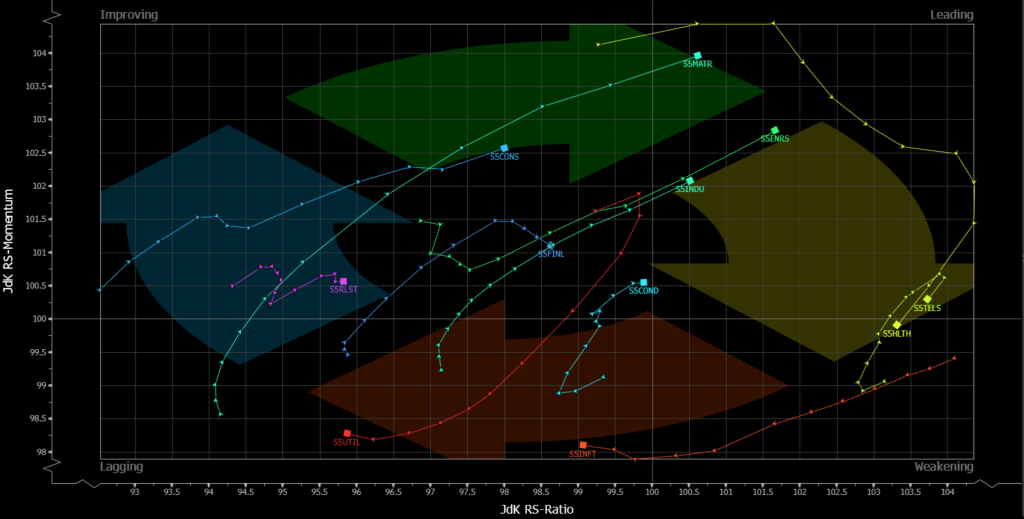 Tuy nhiên, minh chứng rõ ràng nhất cho sự luân chuyển này có lẽ là biểu đồ dưới đây. Trong khoảng sáu tuần trở lại đây, những ngành vốn dẫn dắt thị trường tăng trưởng trước đó – cụ thể là Công nghệ Thông tin và Viễn thông – đã mất đà và hiện đang tụt hậu so với các nhóm ngành khác. Đồng thời, những ngành từng yếu thế trước đây như Năng lượng, Công nghiệp và Nguyên vật liệu đã tiếp nhận vai trò dẫn dắt và bắt đầu vượt trội hơn.