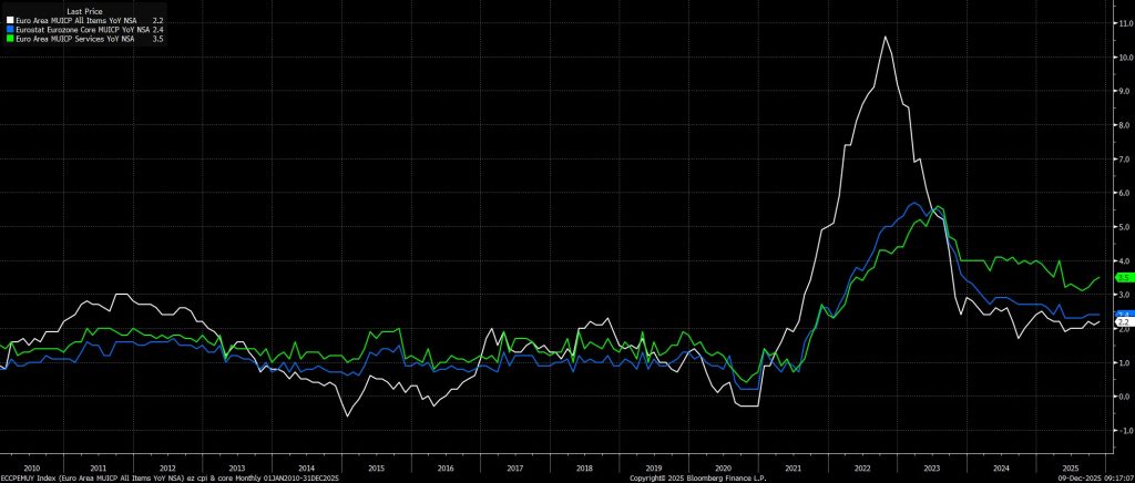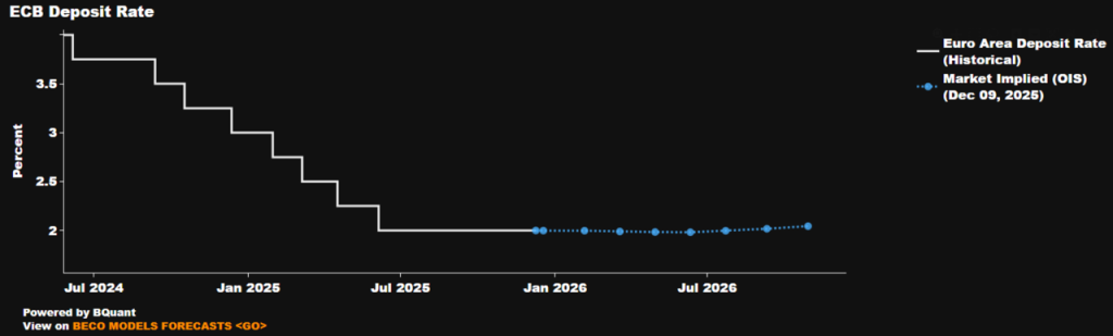 Như đã đề cập, Hội đồng Thống đốc ECB được kỳ vọng sẽ giữ nguyên lãi suất sau cuộc họp chính sách tháng 12, duy trì lãi suất tiền gửi ở mức 2,00%. Quyết định đứng yên này được đưa ra không chỉ vì đường cong OIS của EUR gần như không phản ánh khả năng cắt giảm lãi suất thêm, mà còn vì hầu như không có bất kỳ tín hiệu nào từ các thành viên Hội đồng cho thấy họ mong muốn giảm lãi suất hơn nữa ở thời điểm hiện tại. Mọi dấu hiệu đều cho thấy chu kỳ nới lỏng đã kết thúc, và mức 2,00% hiện được xem là lãi suất cuối của chu kỳ này.