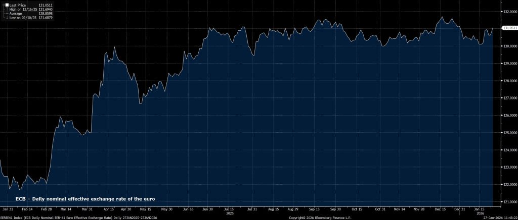 Trong cùng mạch diễn biến này, những lời đe dọa thuế quan nói trên—cùng với vô số lời đe dọa tương tự khác mà Tổng thống Trump đưa ra trong những tuần gần đây—đã kích hoạt một xu hướng “bán tháo nước Mỹ” trên thị trường. Các nhà đầu tư đang xem xét lại mức độ rủi ro trong các khoản đầu tư tại Mỹ do tình trạng liên tục đảo chiều chính sách thuế quan. Hệ quả là đồng EUR tăng mạnh đáng kể, đẩy tỷ giá EUR/USD giao ngay tiến sát mốc 1,19 USD, đồng thời chỉ số EUR NEER của ECB cũng vươn trở lại gần mức đỉnh kỷ lục từng ghi nhận vào cuối năm ngoái—diễn biến này còn được hỗ trợ thêm bởi sự suy yếu mạnh mẽ của đồng yên Nhật (JPY).