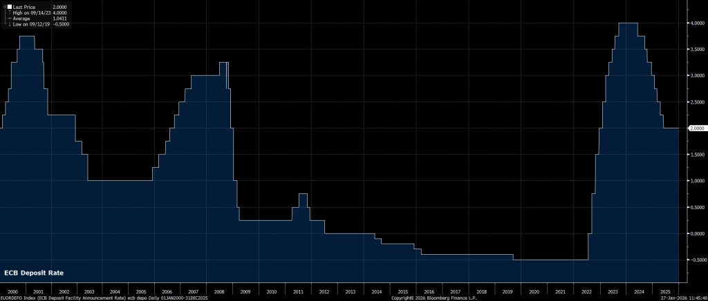 Như đã nêu, Hội đồng Quản trị (GC) dự kiến sẽ giữ nguyên mọi thông số chính sách tại cuộc họp tháng Hai, duy trì lãi suất tiền gửi ở mức 2,00% — mức lãi suất này đã được giữ ổn định từ đầu mùa hè năm ngoái.