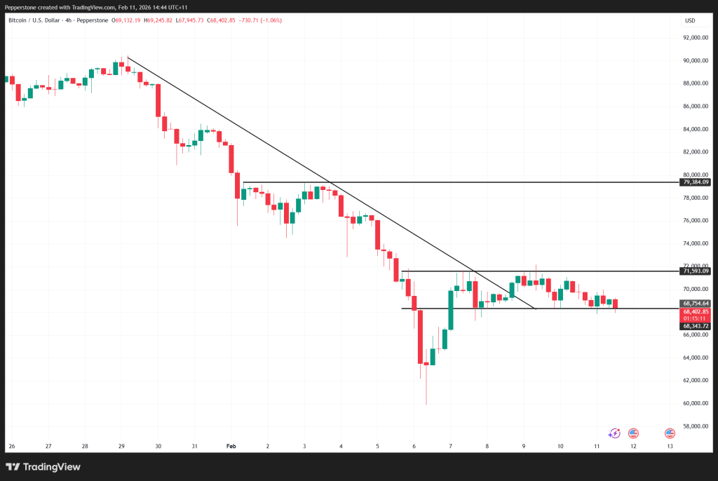 Tại thời điểm viết, BTC/USD đang kiểm định biên dưới của kênh giá quanh mức 68.400. Một phiên đóng cửa 4 giờ xuyên thủng dứt khoát xuống dưới ngưỡng này sẽ làm gia tăng rủi ro điều chỉnh sâu hơn về vùng 64.000, đồng thời đưa mức 60.000 trở thành mục tiêu giảm giá thứ cấp. Các cú phá vỡ biên sau giai đoạn tích lũy thường kéo theo sự gia tăng biến động, khiến mức hỗ trợ này đặc biệt quan trọng đối với các nhà giao dịch ngắn hạn.