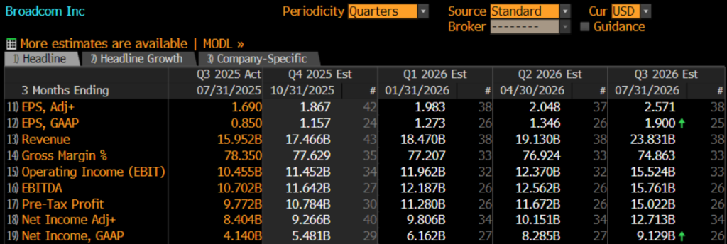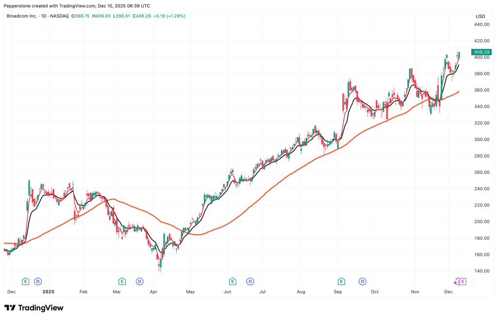 Broadcom sẽ công bố kết quả quý 4 năm 2025 vào sáng ngày 12 tháng 12 (theo giờ AEDT), sau khi thị trường Mỹ đóng cửa vào ngày 11 tháng 12. Tính từ đầu năm đến nay, cổ phiếu đã tăng hơn 75%, đóng cửa trên mức 406 USD vào thứ Ba — một mức cao kỷ lục. Tâm lý thị trường đang rất lạc quan, với kỳ vọng rộng rãi rằng kết quả quý 4 sẽ tiếp tục xu hướng “vượt kỳ vọng” của Broadcom.