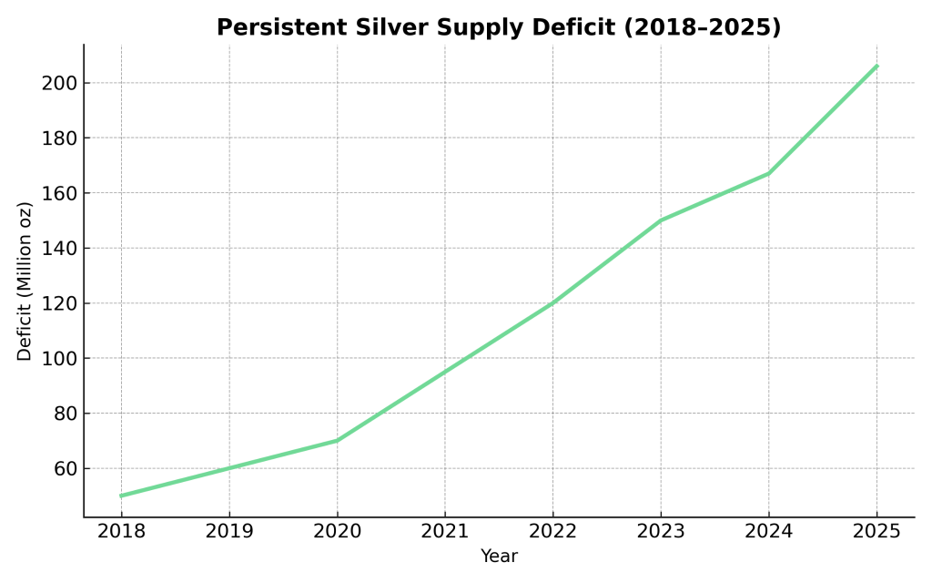 Với nguồn cung bị kìm hãm và nhu cầu ngày càng tăng, tình trạng thâm hụt bạc tiếp tục mở rộng. Theo Crux Investor, mức thiếu hụt nguồn cung bạc toàn cầu dự kiến sẽ đạt 206 triệu ounce vào năm 2025, một xu hướng có khả năng kéo dài. Chính sự thiếu hụt mang tính cấu trúc này là nền tảng cho câu chuyện tăng giá dài hạn của bạc.