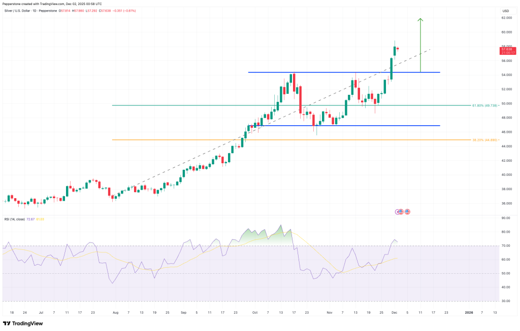 Trong tuần vừa qua, thị trường kim loại quý chứng kiến lực mua lan rộng, trong đó bạc nổi bật hơn cả. Ngày 1 tháng 12, giá bạc giao ngay đã vượt mốc 58 USD/ounce lần đầu tiên trong lịch sử, thu hút sự chú ý lớn từ giới giao dịch.