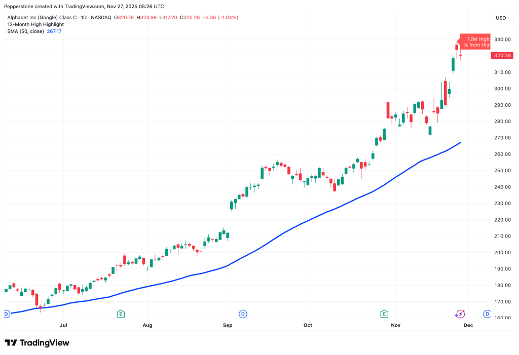 Tuy nhiên, hiệu suất của nhóm AI vẫn phân hóa rõ rệt. Tại Mỹ, các công ty như Nvidia, AMD và Oracle tiếp tục chịu áp lực, trong khi Gemini 3 của Google đã giúp cổ phiếu hãng này tăng khoảng 10% trong hai tuần.