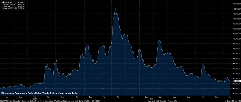 Trên mặt trận thương mại, sau khi Mỹ và Trung Quốc đạt được một thỏa thuận “đình chiến” thương mại được gia hạn và kéo dài hơn vào cuối tháng Mười, mức độ bất định liên quan đến thuế quan đã tiếp tục suy giảm. Giọng điệu ôn hòa hơn vẫn đang chiếm ưu thế giữa hai siêu cường, đặc biệt khi cả ông Trump và ông Tập đều cho rằng mỗi bên đang tuân thủ phần nghĩa vụ của mình trong thỏa thuận. Trong khi đó, phán quyết đối với vụ kiện theo Đạo luật Quyền hạn Kinh tế Khẩn cấp Quốc tế (IEEPA) vẫn đang được chờ đợi; Tòa án Tối cao có thể sẽ chưa đưa ra quyết định cho tới sang năm mới. Dù vậy, trong mọi trường hợp, chính quyền Trump vẫn có những thẩm quyền khác về áp thuế mà họ có thể dựa vào, nếu các mức thuế hiện tại bị phán quyết là trái pháp luật.
