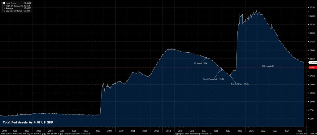 Không chỉ lãi suất quỹ liên bang đang trên đà quay trở lại mức trung lập khoảng 3%, mà bảng cân đối kế toán của Fed cũng đã chạm đáy ở mức trung lập, vào khoảng 20% GDP. Đồng thời, Fed hiện đã nối lại việc mua tín phiếu Kho bạc, hoàn toàn vì mục đích quản lý dự trữ, chứ không nhằm nới lỏng chính sách tiền tệ.