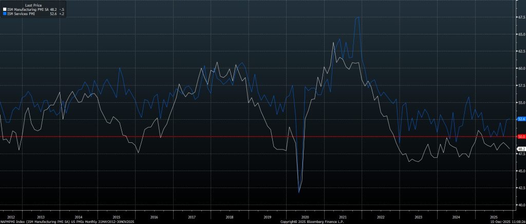 Nền kinh tế Mỹ tiếp tục mở rộng với tốc độ vững chắc, khi mô hình GDPNow của Fed Atlanta cho thấy tăng trưởng đạt 3,6% (tính theo quý trên cơ sở thường niên) trong quý III. Trong khi đó, các chỉ số sản lượng của quý IV sẽ bị kéo thấp do tác động của việc chính phủ đóng cửa, nhưng nhiều chỉ báo khác vẫn cho thấy tăng trưởng duy trì khả năng chống chịu tốt, đặc biệt là chỉ số PMI dịch vụ của ISM đã tăng lên mức cao nhất trong 9 tháng, đạt 52,6 vào tháng trước.