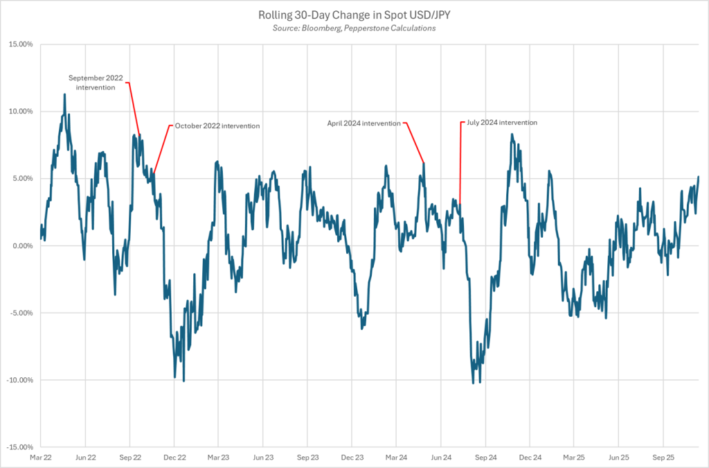 Tuy nhiên, cũng được biết rõ rằng mối quan ngại chính của Bộ Tài chính Nhật Bản (MoF) thường không nằm ở mức tỷ giá mà đồng yên (JPY) đang giao dịch, mà ở tốc độ của biến động thị trường. Tốc độ của đợt biến động gần đây đang phát ra tín hiệu cảnh báo màu vàng, khi tỷ giá USD/JPY đã tăng khoảng 5,2% trong 30 ngày qua — vượt mức tăng 30 ngày từng thấy trước 3 trong 4 lần can thiệp gần nhất.