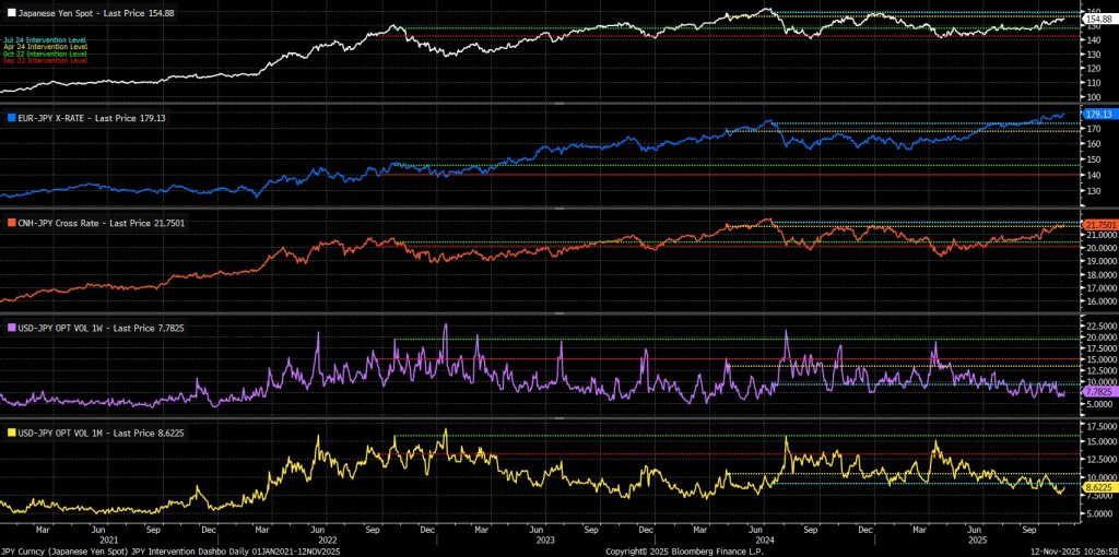 Tuy nhiên, các thước đo về biến động ngụ ý (implied volatility) vẫn ở mức rất thấp, tương đồng với mặt bằng chung của các đồng tiền thuộc nhóm G10, và không cho thấy dấu hiệu rõ ràng rằng một biện pháp can thiệp sắp xảy ra. Thực tế, biến động ngụ ý 1 tháng của cặp USD/JPY đang giao dịch ở mức thấp nhất kể từ mùa hè năm ngoái, trong khi biến động 1 tuần nằm trong nhóm 10% thấp nhất của biên độ dao động 12 tháng qua.