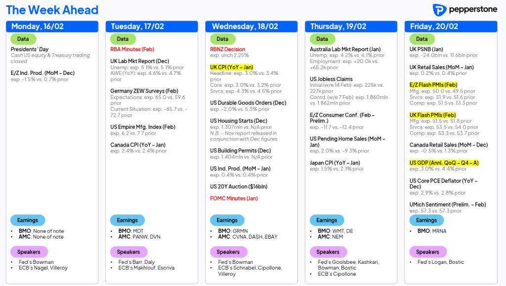 Mỹ sẽ nghỉ Ngày Tổng thống (Presidents’ Day), khiến thị trường chứng khoán cơ sở và trái phiếu Kho bạc Mỹ đóng cửa hôm nay, trong khi hợp đồng tương lai chỉ giao dịch trong khung giờ rút gọn. Tết Nguyên đán Trung Quốc bắt đầu vào thứ Ba, ảnh hưởng đến hoạt động giao dịch trên thị trường cơ sở và phái sinh tại đại lục và Hồng Kông suốt cả tuần. Do gần đây hợp đồng vàng tương lai Thượng Hải đã tác động đáng kể đến hợp đồng vàng tương lai trên sàn CME trong phiên Á, kỳ nghỉ này có thể làm giảm biến động giá vàng trong phiên giao dịch châu Á. Kỳ nghỉ học của các trường ở Anh cũng bắt đầu, có thể làm giảm sự tham gia giao dịch. Liệu các yếu tố nghỉ lễ này có thực sự làm suy giảm đáng kể thanh khoản hay không vẫn còn cần theo dõi, nhưng điều kiện thanh khoản mỏng hơn có thể khuếch đại biến động giá, đặc biệt quanh các sự kiện gây rủi ro.