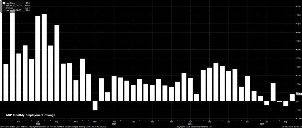 Mặc dù việc chính phủ Mỹ đóng cửa đã khiến dữ liệu việc làm chính thức không thể được công bố, các khảo sát khu vực tư nhân lại cho thấy thị trường lao động Mỹ đang tiếp tục chững lại. ADP báo cáo rằng số việc làm giảm trung bình khoảng 11.000 mỗi tuần trong 4 tuần tính đến cuối tháng 10, trong khi chỉ số thị trường lao động độc quyền của Revelio Labs cho thấy bảng lương đã giảm 9.000 việc làm trong tháng trước. Dù tâm lý chung trên thị trường lao động vẫn là “không tuyển thêm, không sa thải”, ngày càng có nhiều lo ngại rằng cán cân có thể nghiêng rõ rệt hơn về phía sa thải trong các tháng tới, qua đó gây áp lực lên chi tiêu của người tiêu dùng.