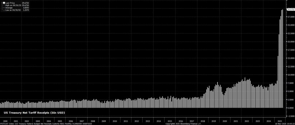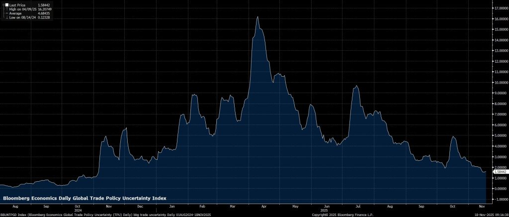 Mặc dù giọng điệu hòa hoãn hơn về thương mại hiện là một phần của luận điểm tăng giá, vấn đề thuế quan có thể vẫn tiềm ẩn rủi ro, đặc biệt khi Tòa án Tối cao Mỹ đang xem xét tính hợp pháp của các mức thuế IEEPA, và việc Tổng thống Trump áp thuế dựa trên cái gọi là “tình trạng khẩn cấp kinh tế.” Trong phiên điều trần đầu tiên, các thẩm phán tỏ ra hoài nghi đối với lập luận này, điều có thể dẫn đến phán quyết rằng các mức thuế liên quan là bất hợp pháp. Nếu điều đó xảy ra, các doanh nghiệp có thể đòi lại số thuế đã nộp trước đây, và khoản hoàn trả tiềm năng có thể lên tới khoảng 200 tỷ USD.