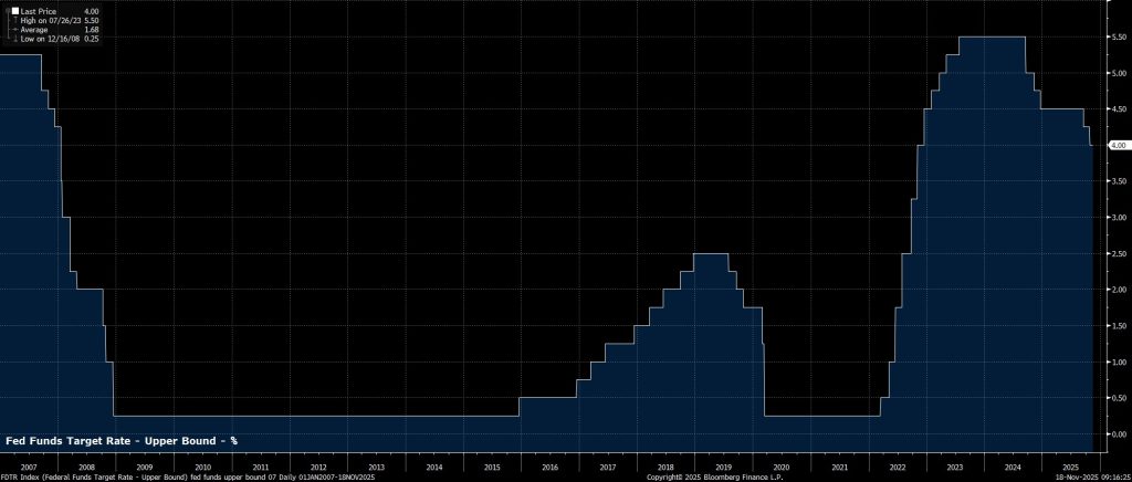 Bất chấp vô số quan ngại và việc chính phủ Mỹ đóng cửa kéo dài kỷ lục, nền kinh tế Mỹ tiếp tục vượt xa hầu hết kỳ vọng. Mô hình GDPNow của Fed Atlanta cho thấy tăng trưởng GDP quý mới nhất đạt 4,1% (theo quý, điều chỉnh theo năm), sau mức tăng mạnh 3,8% trong quý II. Trong khi đó, các chỉ số nhanh hơn như khảo sát PMI ISM cho thấy khu vực dịch vụ vẫn mở rộng ổn định, còn chi tiêu tiêu dùng vẫn mạnh bước vào mùa lễ, với dữ liệu từ Mastercard ghi nhận doanh số bán lẻ tăng 3,5% so với cùng kỳ tháng trước.