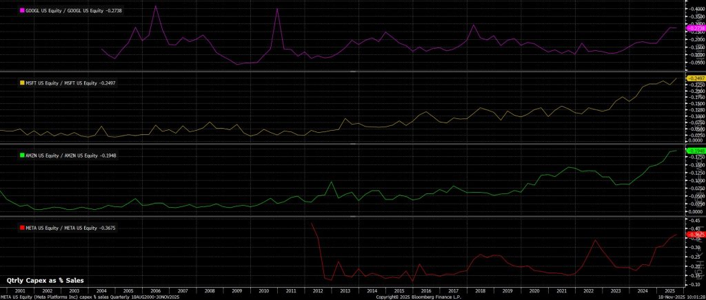 Sự hứng khởi đối với làn sóng AI đã hạ nhiệt đáng kể, khi thị trường chuyển từ tư duy “mọi khoản đầu tư đều tốt” sang giai đoạn đặt câu hỏi về tốc độ chi tiêu khổng lồ của các hãng hyperscaler. Những nghi vấn này không chỉ xoay quanh tỷ suất sinh lời (RoI) — tức mức độ lợi nhuận có thể đạt được và khung thời gian lợi nhuận sẽ xuất hiện — mà còn liên quan đến cách thức các khoản đầu tư này được tài trợ. Ngày càng có nhiều lo ngại khi các công ty big tech tăng cường phát hành nợ để tài trợ cho chi tiêu vốn (capex), thay vì sử dụng dòng tiền tự do (free cash flow). Điều này làm dấy lên nghi ngờ về tính bền vững của chu kỳ đầu tư AI hiện tại.