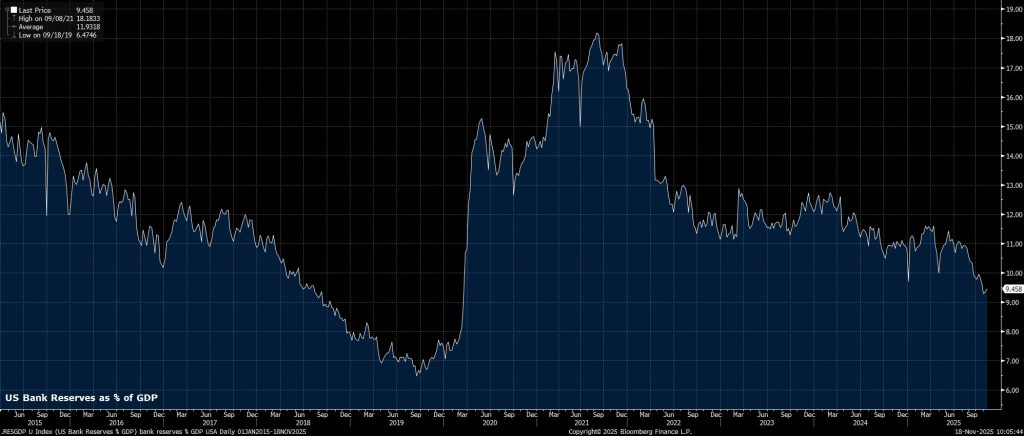 Trong vài tuần gần đây, những lo ngại ngày càng gia tăng về tình trạng thắt chặt trong thị trường tiền tệ Mỹ, khi chênh lệch giữa EFFR và IORB thu hẹp xuống mức thấp nhất kể từ đầu năm 2021 (thậm chí sắp chuyển sang dương), đồng thời dự trữ ngân hàng tiếp tục cạn kiệt, hiện đang ở mức thấp trước đại dịch khi so sánh với GDP và nợ phải trả của các ngân hàng thương mại. Dù FOMC đã chủ động quyết định chấm dứt chương trình thu hẹp bảng cân đối từ đầu tháng 12, những lo ngại đáng kể vẫn tồn tại về việc liệu quyết định này có đến quá muộn hay không, đặc biệt khi thị trường chuẩn bị bước vào giai đoạn cuối năm — vốn luôn là thời điểm căng thẳng nhất về thanh khoản.