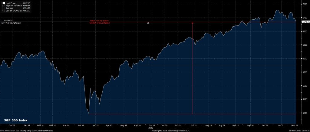 Không thể phủ nhận rằng thị trường chứng khoán đã đi một chặng đường rất dài trong năm nay, với S&P 500 vẫn tăng khoảng 15% bất chấp nhịp điều chỉnh gần đây, và tăng tới 35% so với đáy hồi đầu tháng 4. Chính vì vậy, tâm lý “kiệt sức” trong giới đầu tư là điều dễ hiểu, sau đà tăng quá nhanh và quá mạnh suốt bảy tháng qua. Diễn biến này khiến nhiều người tự hỏi liệu có nên tiếp tục đuổi theo thị trường ở vùng giá cao hiện tại, hoặc mạo hiểm “bắt dao rơi” khi chỉ còn khoảng 4 tuần nữa là kết thúc năm 2025. Với nhiều nhà đầu tư, đây rõ ràng là tỷ lệ rủi ro–lợi nhuận không hấp dẫn, khiến họ ưu tiên đứng ngoài quan sát thay vì tiếp tục lao vào thị trường ở giai đoạn nhạy cảm này.