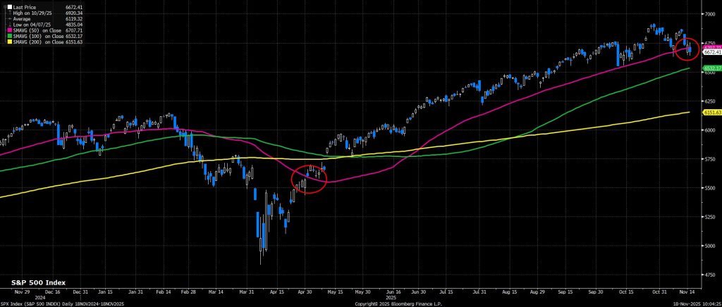Trong khi các chỉ báo nội tại của thị trường bắt đầu có dấu hiệu suy yếu, bức tranh kỹ thuật cũng không mấy tích cực. Phiên thứ Hai chứng kiến S&P 500 đóng cửa dưới đường trung bình động 50 ngày (50-day MA) lần đầu tiên kể từ cuối tháng 4, chấm dứt chuỗi giữ vững trên đường MA dài thứ hai trong 25 năm qua. Điều này cho thấy phe mua không còn đủ khả năng hoặc không muốn bảo vệ ngưỡng hỗ trợ quan trọng — vốn là nền tảng duy trì xu hướng tăng trong phần lớn năm nay. Hệ quả là phe bán có thể giành lại quyền kiểm soát trong ngắn hạn, khi thống kê ba năm gần đây cho thấy: trong khoảng 2/3 các trường hợp S&P 500 đóng cửa dưới MA50, thị trường tiếp tục giảm trong tuần kế tiếp.