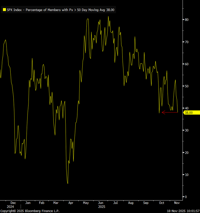 Thị trường đã ở trong trạng thái tập trung cực độ trong một thời gian dài, và những lo ngại về độ rộng thị trường thu hẹp lại một lần nữa xuất hiện. Không chỉ 5 cổ phiếu lớn nhất trong S&P 500 chiếm tới 30% trọng số chỉ số, mà các chỉ báo nội tại của thị trường cũng đang phát tín hiệu cảnh báo. Chỉ 38% số cổ phiếu trong chỉ số hiện giao dịch trên đường trung bình 50 ngày, mức thấp nhất trong một tháng, trong khi chưa đến một nửa số cổ phiếu nằm trên đường trung bình 200 ngày, mức thấp nhất kể từ giữa mùa hè. Ngoài ra, tính đến phiên đóng cửa thứ Hai, chỉ 4% cổ phiếu trong chỉ số đạt mức cao mới trong 4 tuần, so với 20% cổ phiếu đang giao dịch ở mức thấp mới trong 4 tuần.