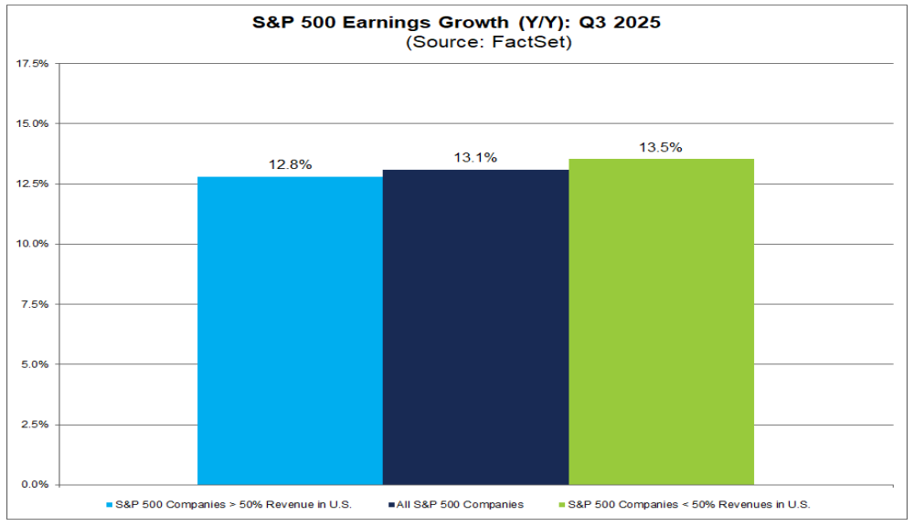 Mùa báo cáo lợi nhuận quý 3 đang diễn ra rất tích cực, với 92% số công ty trong S&P 500 đã công bố kết quả. Không chỉ 8 trên 10 doanh nghiệp báo cáo EPS vượt kỳ vọng, mà tổng chỉ số đang hướng đến mức tăng trưởng lợi nhuận khoảng 13% so với cùng kỳ, đánh dấu quý thứ tư liên tiếp có tăng trưởng lợi nhuận hàng năm. Các doanh nghiệp cũng tỏ ra ít lo ngại hơn về rủi ro suy giảm, khi số lần đề cập đến “thuế quan” trong các cuộc gọi lợi nhuận giảm một phần ba so với quý 2. Trong khi đó, biên lợi nhuận ròng đã tăng lên mức cao nhất trong ít nhất 15 năm đối với toàn bộ chỉ số.
