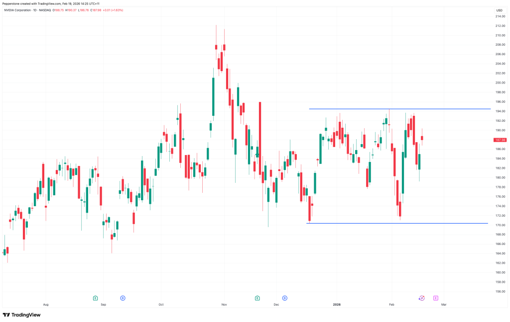 Sau khi thị trường Mỹ đóng cửa vào ngày 25 tháng 2, NVIDIA (NVDA) sẽ công bố kết quả kinh doanh quý IV năm tài chính 2026. Kể từ đầu năm, cổ phiếu này đã giao dịch đi ngang trong biên độ từ 170 đến 195 USD, phản ánh lo ngại của giới giao dịch về định giá cao của nhóm công nghệ, tính bền vững của chi tiêu vốn quy mô lớn cho AI, và sự thận trọng liên quan đến khả năng sinh lời từ các ứng dụng AI ở hạ nguồn.
