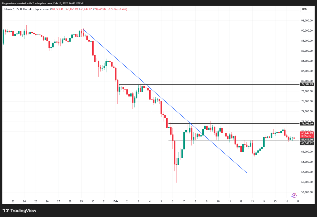 Mức đóng cửa tuần trước tại 68.418 USD theo dữ liệu giá từ Pepperstone là một điểm tham chiếu hữu ích. Phe bò nhiều khả năng sẽ sử dụng mức đóng cửa này như một ngưỡng pivot để đánh giá xem đà tăng có đang ổn định trở lại hay tiếp tục suy yếu thêm.