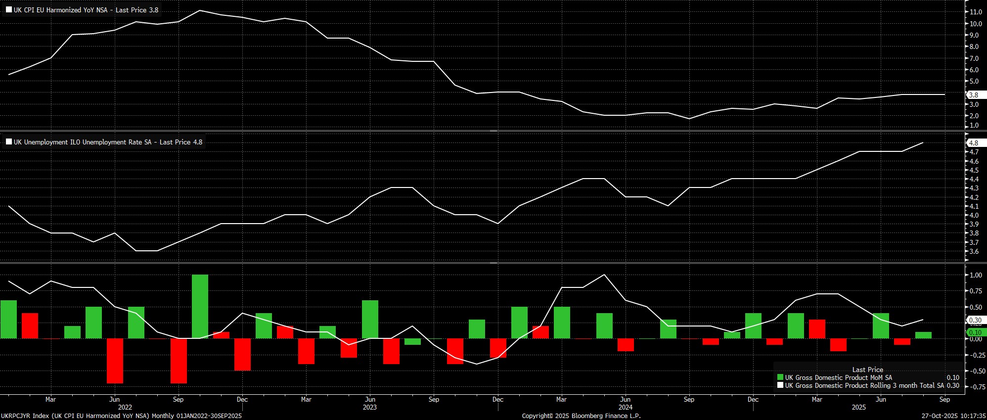 Thứ ba, và cũng là điểm cuối cùng, mặc dù trong những tháng gần đây Ủy ban Chính sách Tiền tệ (MPC) có sự chia rẽ về thời điểm thích hợp để bắt đầu cắt giảm lãi suất, nhưng dường như không có nhiều khác biệt trong quan điểm về những yếu tố kinh tế vĩ mô cần được ưu tiên trong quá trình ra quyết định chính sách. Đối với đa số thành viên, ưu tiên kiểm soát rủi ro lạm phát dai dẳng vẫn quan trọng hơn nhu cầu hỗ trợ thị trường lao động Anh đang chững lại. Do đó, việc tỷ lệ thất nghiệp tăng lên 4,8% trong ba tháng tính đến tháng 8 — mức cao nhất trong 4 năm — nhiều khả năng sẽ không ảnh hưởng đáng kể đến quyết định sắp tới.
