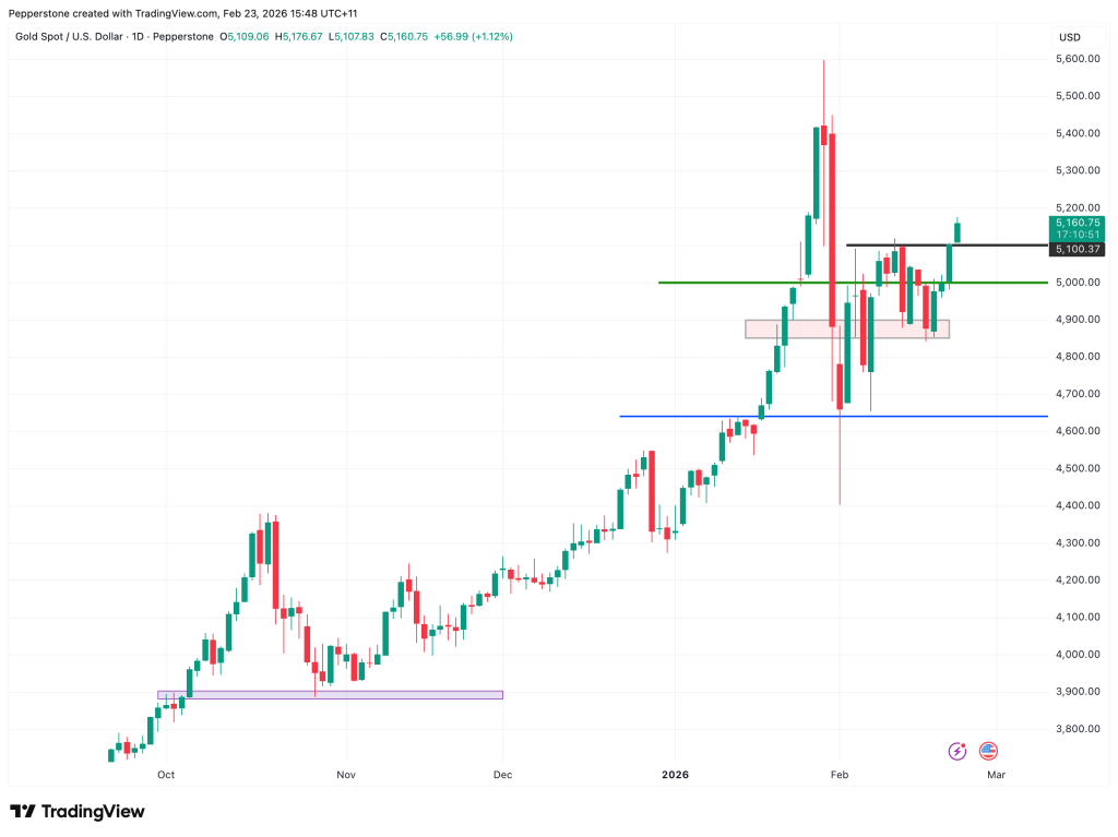 Vàng vượt lên trên mốc 5.100 USD, củng cố cấu trúc tăng giá ngắn hạn. Sự gia tăng bất ổn liên quan đến thuế quan của Mỹ và căng thẳng leo thang giữa Mỹ – Iran đang thúc đẩy nhu cầu tìm nơi trú ẩn an toàn. Hỗ trợ ngắn hạn hiện nằm trong vùng 5.100 – 5.000 USD, trong khi kháng cự gần nhất ở mức 5.200 USD. Các nhà giao dịch vẫn đang theo dõi sát sao các diễn biến chính sách và địa chính trị.