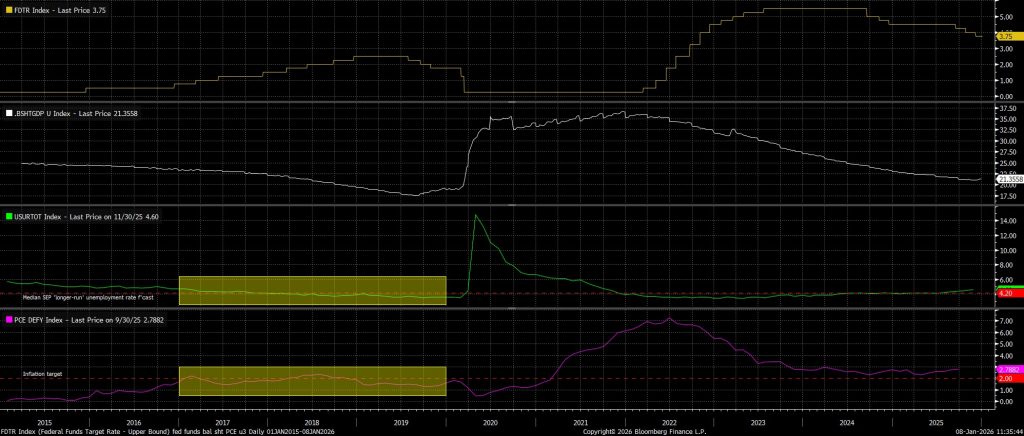 Mặc dù hiện có vô số mô hình cố gắng tính toán mức lãi suất trung lập này, nhưng có lẽ cách đơn giản nhất để ước lượng nó là nhìn lại lịch sử gần đây—cụ thể là giai đoạn gần nhất mà nền kinh tế từng trải qua một “thiên đường” vĩ mô như vậy. Giai đoạn đầu tiên bật ra trong tâm trí chính là từ năm 2017 đến 2019, khi tỷ lệ thất nghiệp (U-3) liên tục duy trì ở mức 4% hoặc thấp hơn, đồng thời lạm phát (theo chỉ số PCE) gần như sát mức mục tiêu 2%. Trong khoảng thời gian đó, lãi suất quỹ liên bang (fed funds rate) đã lên tới đỉnh ở mức 2,50%. Xét theo những biến số này, tình hình kinh tế vĩ mô lúc ấy rõ ràng là “ổn thỏa”—do đó, ta có thể giả định một cách hợp lý rằng mức lãi suất quỹ liên bang 2,50% chính là mức lãi suất phản ánh chính sách tiền tệ trung lập.