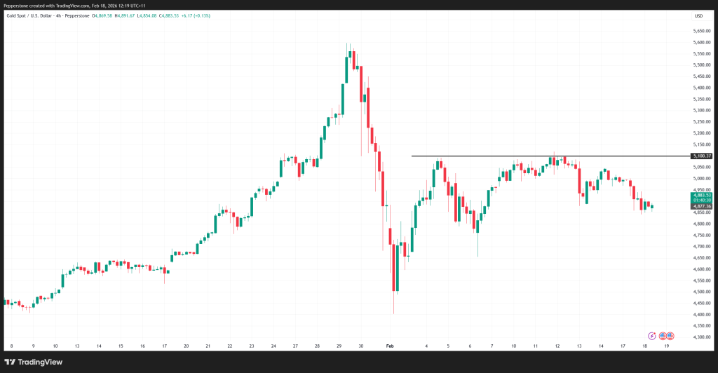 Suốt tháng Hai, vàng liên tiếp va phải một vùng cung mạnh tại mức 5.100 USD trước khi lùi về mức thấp nhất là 4.941 USD. Việc không thể bứt phá lên cao cho thấy đà tăng giá đã tạm thời đình trệ, ít nhất là trong ngắn hạn.