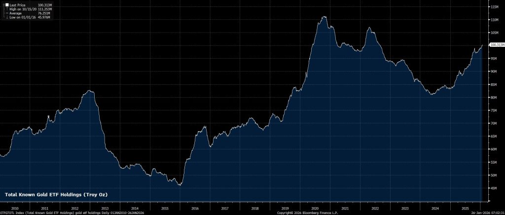 Tuy nhiên, nhu cầu từ nhà đầu tư bán lẻ cũng đang tạo ra một lực hỗ trợ tích cực. Khối lượng vàng nắm giữ trong các quỹ ETF vàng – một đại diện hữu ích cho nhu cầu bán lẻ – hiện đã tăng vượt mốc 100 triệu ounce, gần như tăng liên tục kể từ đầu năm ngoái. Tuy nhiên, điều đáng chú ý là khối lượng này vẫn còn cách xa đáng kể so với các mức đỉnh gần đây, không chỉ so với mức đỉnh năm 2022 khi rủi ro địa chính trị gia tăng mạnh sau cuộc xâm lược Ukraine của Nga, mà còn thấp hơn khoảng 10 triệu ounce so với mức đỉnh vào cuối năm 2020, thời điểm cao trào của đại dịch.